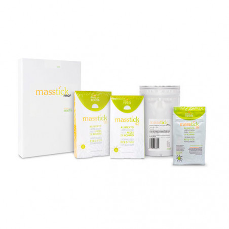 Masstick® es una pasta autoadhesiva que se presenta en modo de polvo, listo para ser rehidratado. La presentación en polvo rehidratable permite que Masstick® pueda ser empastado con pulpa de moluscos o crustáceos, huevos de pescado, de moluscos o crustáceos, artemias, mysidaceos, copépodos, rotíferos, y medicamentos administrables por vía oral.